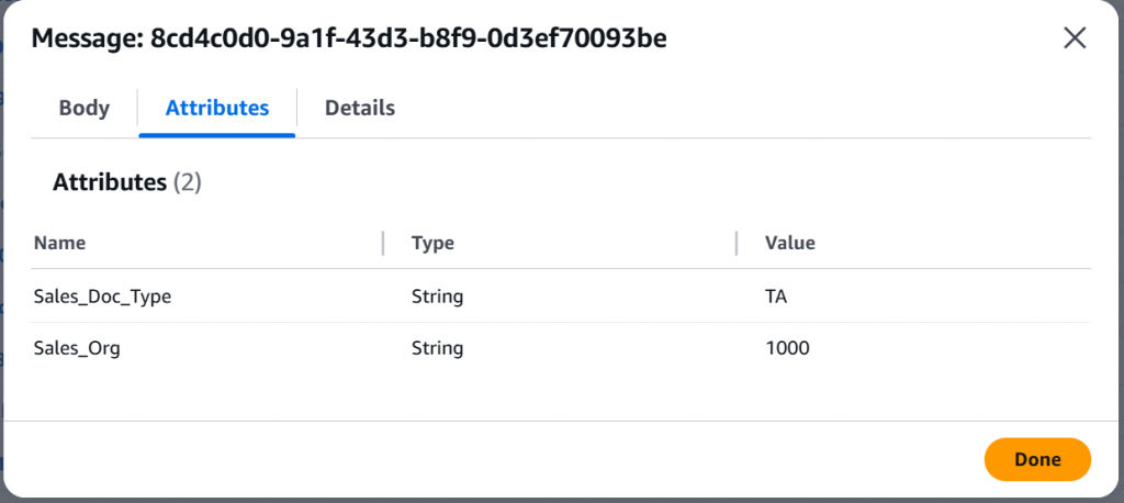 This is further illustrated in Amazon SQS when reviewing the message received in the queue: